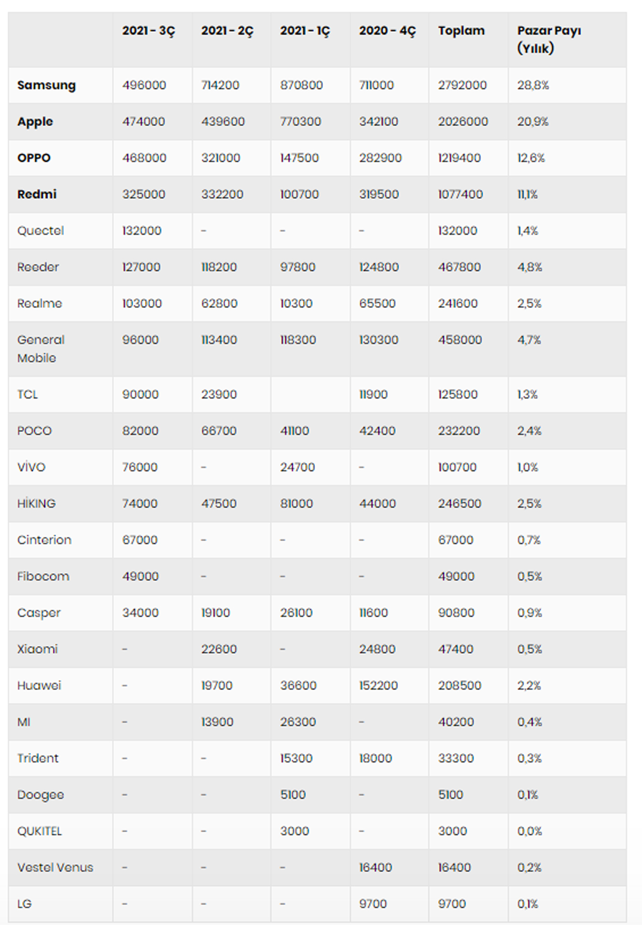 Türkiye pazarında faaliyet gösteren akıllı telefonlarda marka bazında güncel sıralama belli oldu. Bilgi Teknolojileri ve İletişim Kurumu (BTK), yayınladığı Türkiye Elektronik Haberleşme Sektörü Üç Aylık Pazar Verileri Raporu’nun 2021 yılı 3. çeyrek sonuçlarıyla Mobil Cihaz Kayıt Sistemine (MCKS) ithalat ve imalat yoluyla kaydedilen cihaz sayılarını açıkladı.