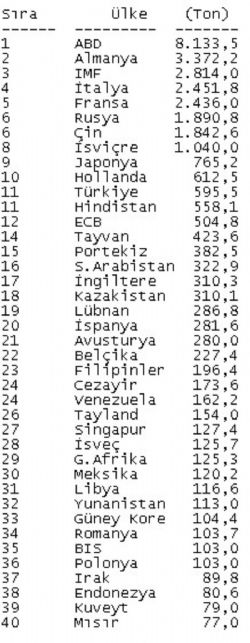 Dünya Altın Konseyi (World Gold Council) tarafından açıklanan verilerine göre, ilk çeyrek itibariyle ABD 8.133,5 ton rezervle ilk sırada yer alırken, Almanya 3.372,2 ton ile ikinci sırada, IMF 2.814,0 ton ile üçüncü sırada bulunuyor. İlk üç sırada bir önceki döneme göre değişiklik olmadı.