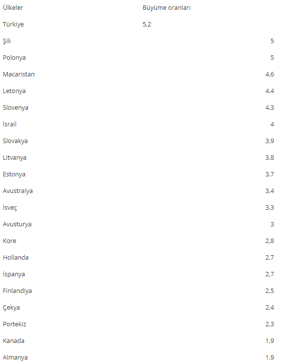 TÜİK, OECD ve Eurostat'a göre verileri açıklanan ülkelerin 2018 yılının ikinci çeyreğine ilişkin büyüme oranları şöyle:
