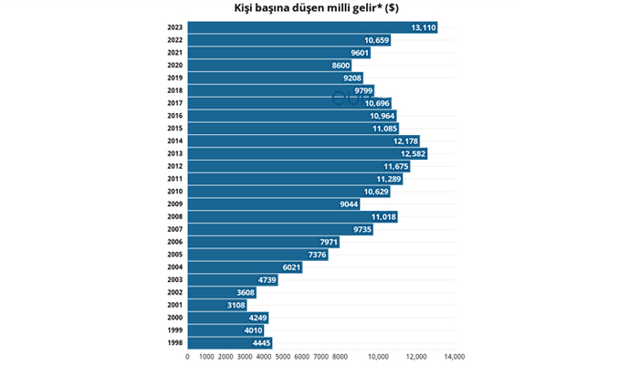 Bu tarihten sonra kademeli olarak düşen milli gelir 2020’da 8 bin 600 dolara kadar geriledi. 2013-2020 arasında kişi başına milli gelir dolar bazında hep düştü. 2022’de tekrar 10 bin sınırını aşarak 2023’te tüm zamanların rekoru kırıldı.