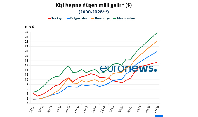 IMF tahminine göre 2028 yılında Türkiye’de kişi başına düşen milli gelir 17 bin 333 dolara yükselecek. Dünyadaki sıralaması ise 68. olacak.