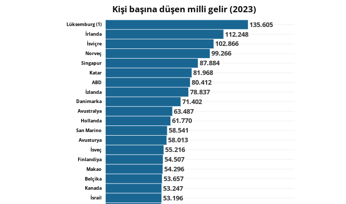 2023 yılında dolar bazında kişi başına milli gelirin en yüksek olduğu ülke 135 bin 605 dolar ile Lüksemburg. Bu miktar ABD’de 80 bin 412 dolar; Almanya’da 52 bin 824 dolar.