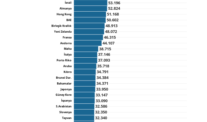 2022 yılında ise 78. sıradaydı. Önemli bir yükseliş gibi görünse de, Türkiye'nin 2003 yılında da dünyada 69. sırada olduğu göz önüne alındığında son 20 yılda aynı basamakta kaldığı sonucu çıkıyor.