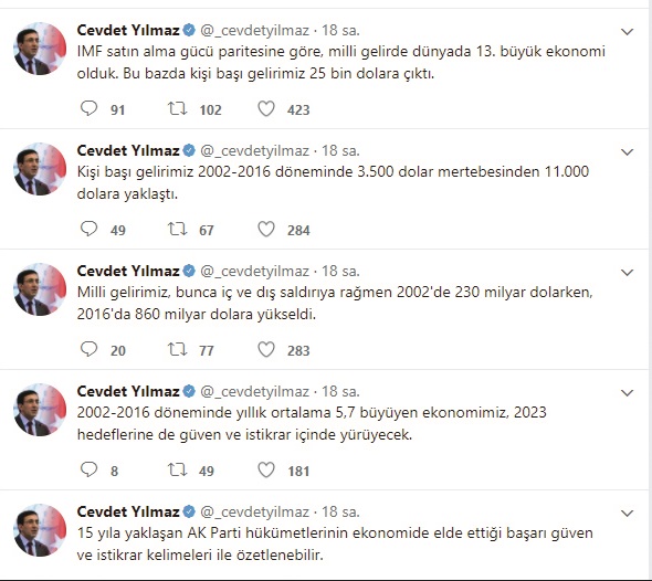 Cevdet Yılmaz da sosyal medya hesabındaki açıklamasında bu noktaya dikkat çekerek, “16 Nisan sonrası siyasi istikrarı kurumsal güvenceye kavuşturmuş bir ülke olarak, 2023 hedeflerine emin adımlarla yürüyeceğiz. 15 yıla yaklaşan AK Parti hükümetlerinin ekonomide elde ettiği başarı güven ve istikrar kelimeleri ile özetlenebilir” bilgisini paylaştı.