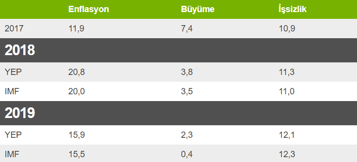 IMF'nin 2019 büyüme tahmini yüzde 0,4 ve enflasyon tahmini yüzde 15,5.