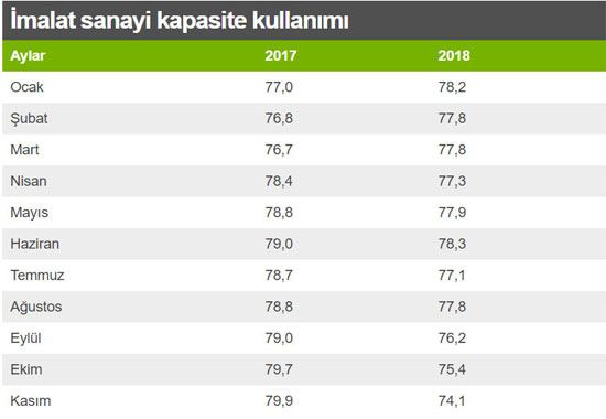 2018 yılının özellikle 3. çeyreğindeki düşüş sanayi üretimi ve kapasite kullanımına paralel bir görünüm sergiliyor.
