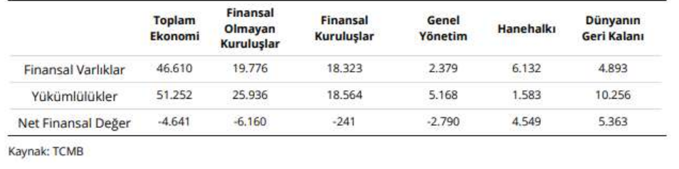 Türkiye Cumhuriyet Merkez Bankası(TCMB) tarafından açıklanan rapora göre, dönem sonu itibarıyla sektörlerin toplam finansal varlıkları 46,6 trilyon TL, yükümlülükleri ise 51,3 trilyon TL düzeyinde gerçekleşti.