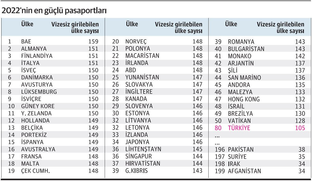 2022 yılı Henley Pasaport Endeksi yayınlandı. 199 ülke, eyalet ve bölgenin pasaportları ile kaç yere vize ile kapıda vize ve vizesiz olarak giriş yapabilmesi baz alınarak oluşturulan Henley Pasaport Endeksi’ne göre Birleşik Arap Emirlikleri (BAE) pasaportuyla 159 ülkeye vizesiz girilebiliyor. Buna göre en güçlü pasaport endeksi listesinin ilk sırasında BAE var.