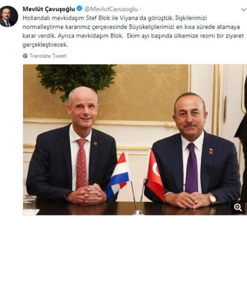 Dışişleri Bakanı Çavuşoğlu sosyal medya hesabından paylaştığı mesajında, "Hollandalı mevkidaşım Stef Blok ile Viyana’da görüştük. İlişkilerimizi normalleştirme kararımız çerçevesinde Büyükelçilerimizi en kısa sürede atamaya karar verdik. Ayrıca mevkidaşım Blok, Ekim ayı başında ülkemize resmi bir ziyaret gerçekleştirecek" ifadelerini kullandı.