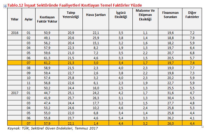 Güven endeksine yönelik raporda öne çıkan gelişmeler şöyle sıralandı: “İnşaat sektöründe güven endeksinin (takvim ve mevsim etkisinden arındırılmamış endeks verileri) 2017 yılının ilk 4 ayındaki yükselişin ardından son üç aydır gerilediği görülüyor. İnşaat sektörü güven endeksi Mayıs ve Haziran aylarındaki sınırlı gerilemenin ardından Temmuz ayında da düştü. İnşaat sektörü güven endeksi Temmuz ayında 3,3 puan geriledi. İnşaat sektöründe güven alanında yaşanan hızlı artıştan ve ulaşılan zirveden sonra bir gerileme yaşanıyor. Güvenin yeniden artışı için ilave iyileşmelere ihtiyaç duyuluyor.”