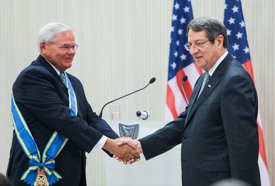 Kongre’de Dış İlişkiler Komitesi’nin başkanı olarak görev alan Menendez, Kıbrıs Rum Kesimi’ne gitti ve Türkiye karşıtı ifadeler kullandı. Menendez, Rum lider Nikos Anastasiades ile bir araya geldi. Anastasiades tarafından onur madalyası verilen Menendez, “Benim bu ilişkiye, Kıbrıs’a bağlılığım çok derin ve ABD’de senatör olarak görev aldığım sürece de devam edecek” dedi.