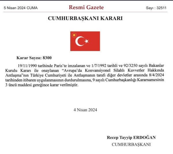 Rusya'nın 2023’te çekildiği Avrupa’da Konvansiyonel Silahlı Kuvvetler Antlaşması’ndan (AKKA) Türkiye de çekildi. Karar, Resmi Gazete'de yayımlandı.