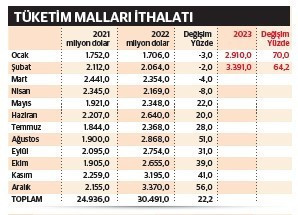 Ocak 2023’e gelindiğinde aynı tüketim malları ithalatındaki artış eğilimi yerinde saymasına karşın 3 milyar doların hemen altında kaldı. Buna karşın aylık ithalat bir önceki yılın ocak ayına göre yüzde 70’e çıkarak 1,7 milyar dolardan 2 milyar 910 milyon dolara çıktı. Şubat ayında ise tüketim malları ithalatı yüzde 64,2 artışla 2 milyar 64 milyon dolardan 3 milyar 391 milyon dolara çıktı. İki aylık artış 3 milyar 770 milyon dolardan yüzde 64,2 artışla 6 milyar 301 milyon dolara çıktı.