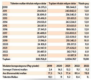 Türkiye’nin tüketim malları ithalatı 1010’da 24,3 milyar dolar ile 185,5 milyar dolarlık ithalattan yüzde 13 pay aldı. 2011’de ithalat 29,6 milyar dolar ile 240,8 milyar dolarlık ithalattan yüzde 12 pay aldı. 2012’de ithalat 26,7 milyar dolara gerilerken 236,5 milyar dolarlık ithalatta payı yüzde 11 oldu. 2013’te ithalat 30,4 milyar dolara, ithalattaki payı yüzde 12’ye çıktı. 2014’te tüketim malı ithalatı 29 milyar dolar, 251,6 milyar dolarlık ithalattaki payı değişmeyerek yüzde 12 oldu. 2015’de tüketim malları ithalatı 28,5 milyar dolar, payı yüzde 11, 2016’da ithalat 27,9 milyar dolar, payı yüzde 14 oldu. 2017’de ithalat 28,4 milyar dolar, payı yüzde 12 oldu.