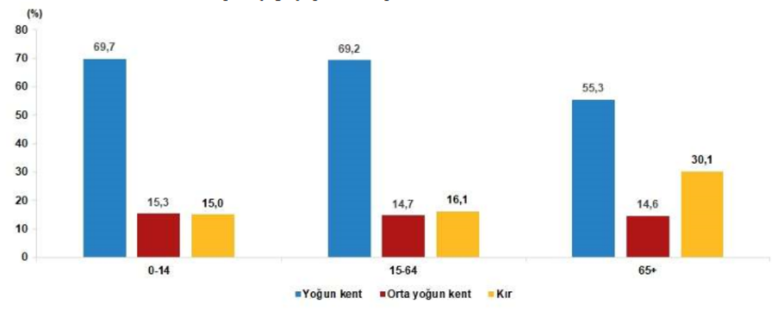Türkiye nüfusunun %68,1'ini oluşturan 15-64 yaş grubu çalışma çağındaki nüfus içinde yoğun kent olarak sınıflandırılan yerlerde yaşayanların oranı %69,2 oldu. Bu yaş grubundaki toplam nüfus içinde orta yoğun kent olarak sınıflandırılan yerlerde ikamet edenlerin oranı %14,7 iken; kır olarak sınıflandırılan yerlerde ikamet edenlerin oranı %16,1 olarak gerçekleşti.