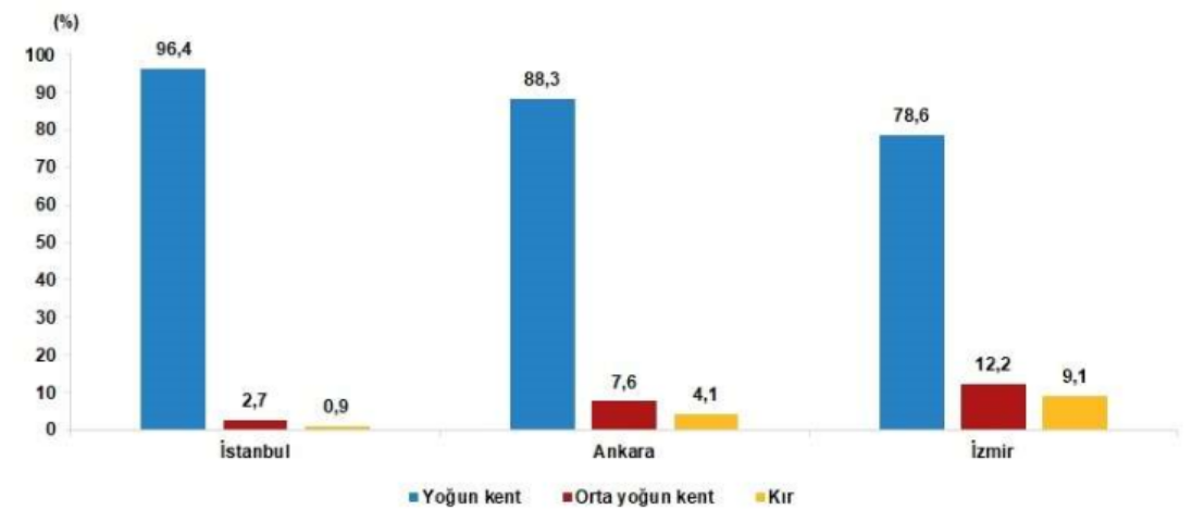 ADNKS, 2022 sonuçlarına göre en yüksek nüfusa sahip il olan İstanbul'da ikamet edenlerin %96,4'ünün yoğun kent, %2,7'sinin orta yoğun kent ve %0,9'unun kır olarak sınıflandırılan yerleşim yerlerinde yaşadığı görüldü. Türkiye'nin ikinci büyük nüfusuna sahip il olan Ankara'da ikamet edenlerin %88,3'ünün yoğun kent, %7,6'sının orta yoğun kent ve %4,1'inin kır olarak sınıflandırılan yerleşim yerlerinde yaşadığı görüldü. Nüfus büyüklüğü açısından üçüncü sırada yer alan İzmir'de ikamet edenlerin ise %78,6'sının yoğun kent, %12,2'sinin orta yoğun kent ve %9,1'inin kır olarak sınıflandırılan yerleşim yerlerinde yaşadığı görüldü.