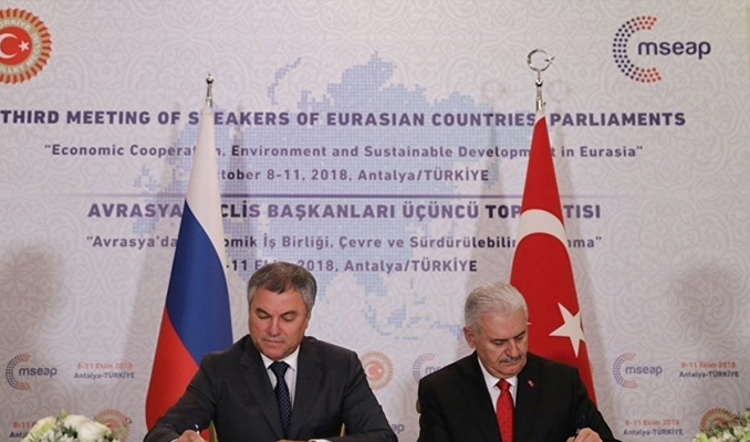 Duma Başkanı Vyaçeslav Volodin ve TBMM Başkanı Binali Yıldırım, Antalya'daki 3. Avrasya Meclis Başkanları toplantısında iki ülke arasında üst düzey hükümetler arası komisyon kurulmasına ilişkin protokolü imzaladı.