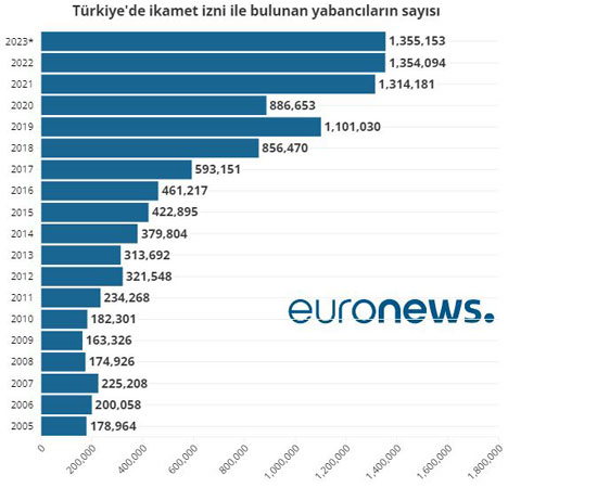 İçişleri Bakanlığı Göç İdaresi Başkanlığı verilerine göre 19 Ocak 2023 itibariyle Türkiye’de 1 milyon 335 bin 153 yabancı resmi izinle ikamet ediyor. 2005 yılında ikamet izni bulunan yabancı sayısı 179 bin idi. 2015 yılında 400 bini aşan yabancı sayısı 2018 yılında 856 bine ulaştı. İkamet izni ile Türkiye’de yabancı sayısı 2019 yılında ise ilk kez 1 milyonu aşarak 1 milyon 101 bine yükseldi. Son üç yıldır bu sayısı 1,3 milyonun üzerinde seyrediyor.