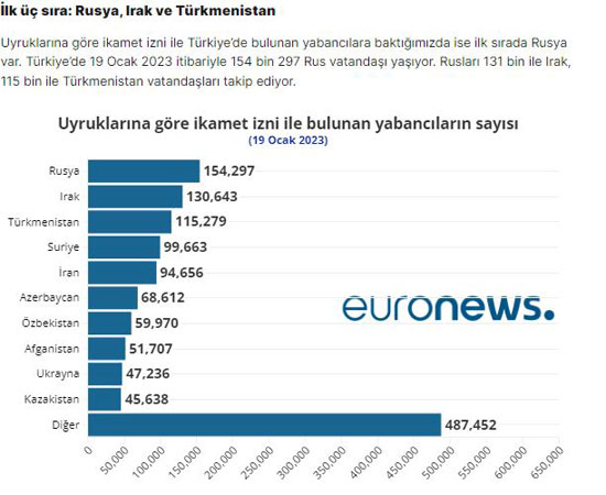 Uyruklarına göre ikamet izni ile Türkiye’de bulunan yabancılara baktığımızda ise ilk sırada Rusya var. Türkiye’de 19 Ocak 2023 itibariyle 154 bin 297 Rus vatandaşı yaşıyor. Rusları 131 bin ile Irak, 115 bin ile Türkmenistan vatandaşları takip ediyor.