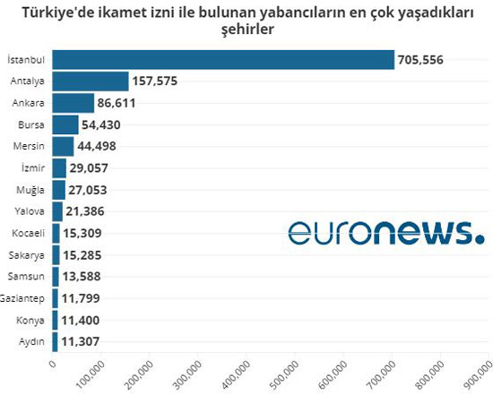 İkamet ile Türkiye’de bulunan 1 milyon 335 bin yabancıdan yarıdan fazlası İstanbul’da yaşıyor. İstanbul’da 706 bin yabancı ikamet izni ile bulunuyor. Bu da toplamın yüzde 52’si demek.