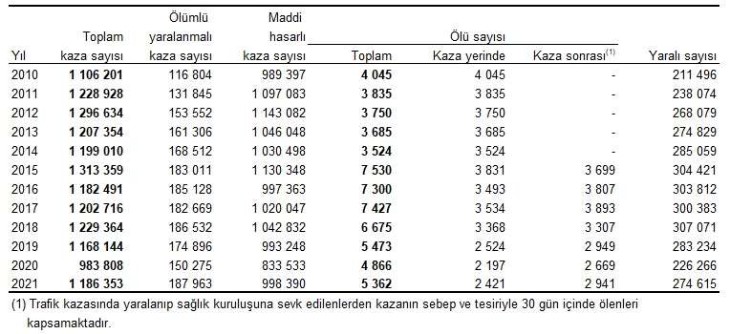 Türkiye İstatistik Kurumu (TÜİK) tarafından yapılan açıklamaya göre, ülkemiz karayolu ağında 2021 yılında toplam 1 milyon 186 bin 353 adet trafik kazası meydana geldi. Bu kazaların 998 bin 390 adedi maddi hasarlı, 187 bin 963 adedi ise ölümlü yaralanmalı trafik kazasıdır. Yıl içerisinde meydana gelen ölümlü yaralanmalı trafik kazalarının %78,6'sı yerleşim yeri içinde %21,4'ü ise yerleşim yeri dışında meydana geldi.