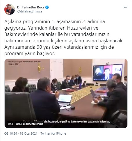 Bakan Koca, tüm illerde huzurevi ve bakımevlerinde aşılamanın hızlı bir şekilde yürütülmesi gerektiğini belirtti. Hafta sonuna kadar huzurevi ve bakımevlerinde yaşanların aşılanmasının tamamlanmasına gayret edelim mesajını verdi.