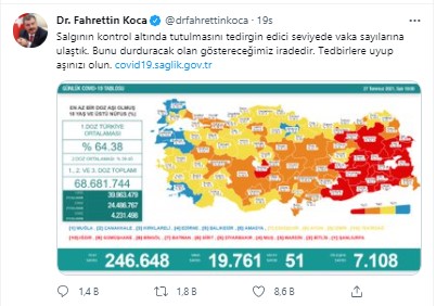 Biz aşılamaya biraz dünyanın gerisinde başladık. Bizden önceki ülkelerin tecrübelerini görmüş oluyoruz. Varyantlar da bizim ülkemize geç ulaşıyor. Birçok ülke aşı teşviki için kolları sıvadı. Aşı zorunluluğu da geliyor. ABD'de bazı eyaletlerde, Avrupa'da çalışanlara aşı zorunluluğu gibi örnekler görüyoruz. Konser ve toplu alanlarda aşı zorunluluğu getiriliyor. Bizim ülkemizin durumuna bakarsak ilk dozunu olmuş 40 milyonun üzerinde insan var. Bugünden sayıp 3 hafta sonra baktığımızda 40 milyon kişi tam aşılanmış olacak. Türkiye'nin yarısı aşılanmış olacak, bu kötü bir rakam değil. İngiltere bizden çok önce başlamasına rağmen ülkenin yarısını aşıladı. Biz ne istiyoruz? 18 yaş üstü nüfusun yüzde 70'ini aşılamak.