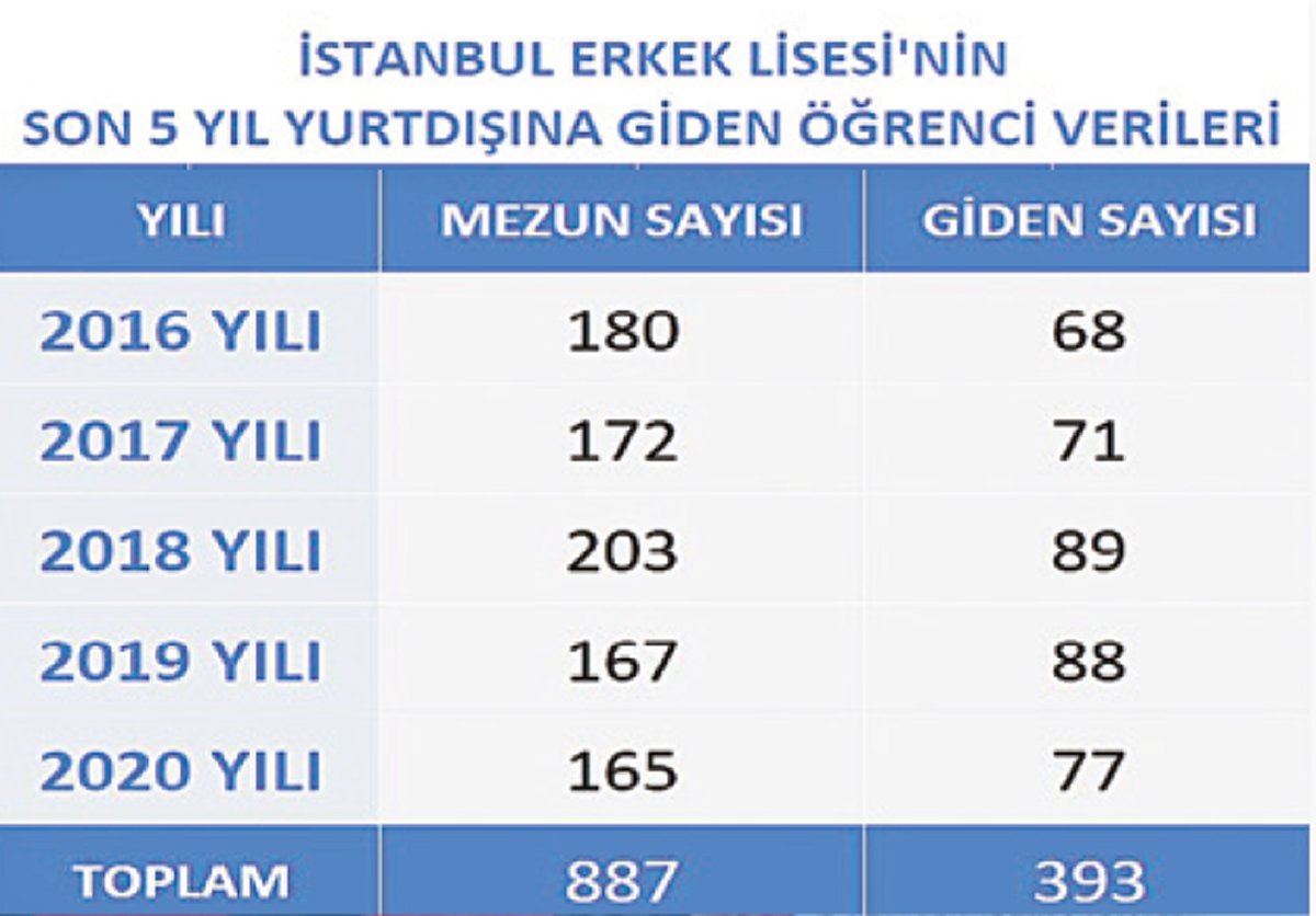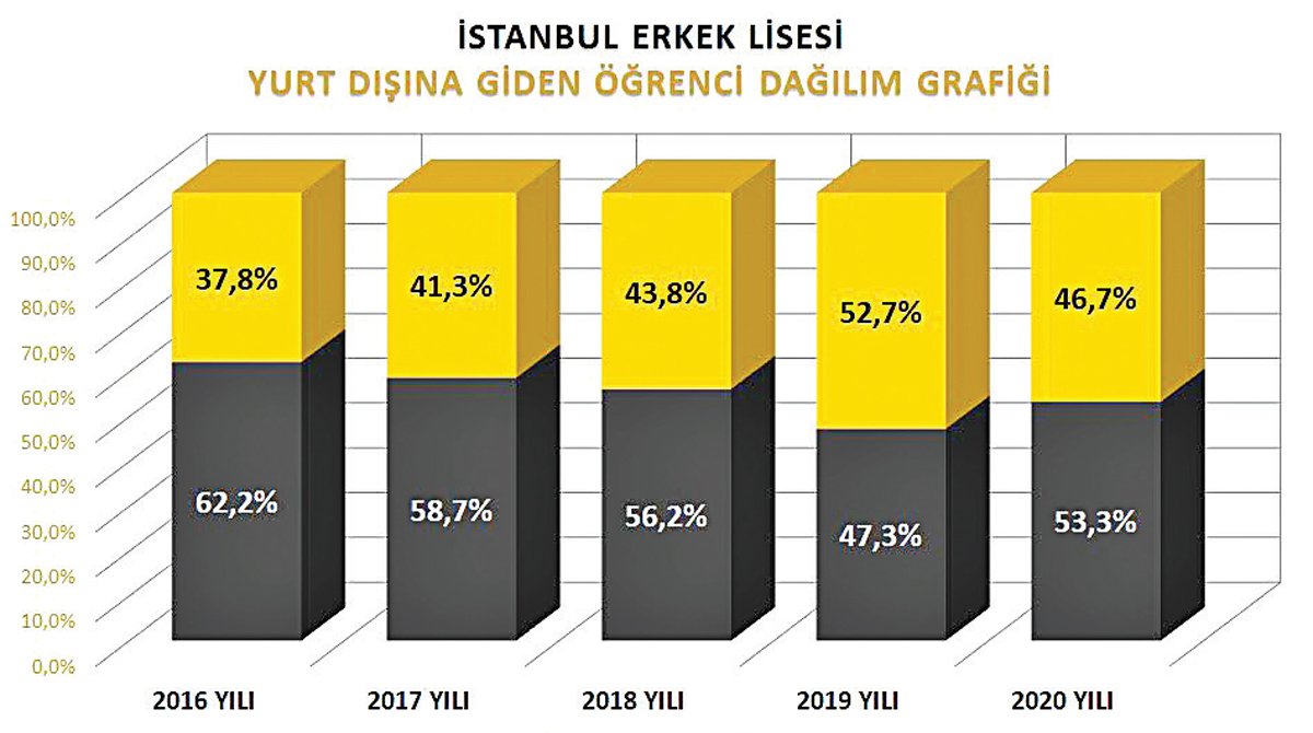 İstanbul Erkek Lisesi'nin bu yılki 165 mezunundan 77'si, yani yüzde 47'si Almanya, Fransa, Kanada, Amerika, Avusturya ve Macaristan’a gitti. Geçen yıl da 167 mezunun 88'i yani yüzde 53'ü yurt dışına gitmişti. Robert Kolej'in 220 mezunundan 113'ü, yani yüzde 52'si de yurt dışında bir üniversitede okumayı seçti.