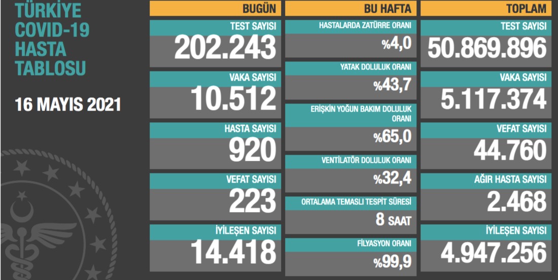 Sağlık Bakanlığı, Türkiye'nin Günlük Korona virüs Tablosu'nu paylaştı.16 Mayıs'ta açıklanan son 24 saatlik verilere göre; 920’si semptomatik olmak üzere toplam 10 bin 512 yeni vaka tespit edildi. Vefat sayısı ise 223 olarak kayıtlara geçti. Böylece Türkiye'de korona virüs nedeniyle hayatını kaybedenlerin sayısı 44 bin 760'a, toplam vaka sayısı ise 5 milyon 117 bin 374'e yükseldi.