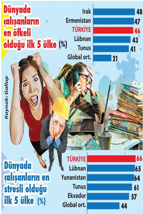Rapora göre dünyada çalışanların stres düzeyi tüm zamanların en yüksek seviyesine, yüzde 44'e yükseldi. Türkiye'ye bakıldığında ise rekor olan bu rakamın çok ötesinde bir sonuç ortaya çıktı: Türkiye'de çalışanların yüzde 66'sı gün içinde yoğun bir stres altında olduğunu belirtti.