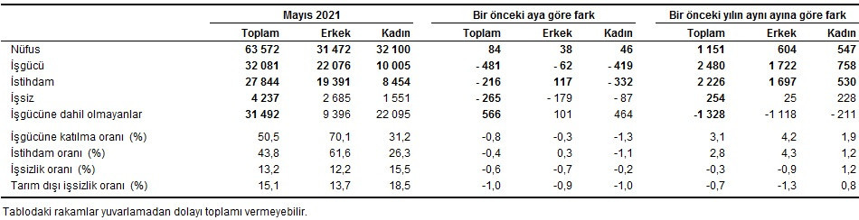İşgücü 2021 yılı Mayıs ayında bir önceki aya göre 481 bin kişi azalarak 32 milyon 81 bin kişi, işgücüne katılma oranı ise 0,8 puanlık azalış ile %50,5 olarak gerçekleşti.