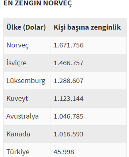 140 ülkenin incelendiği rapora göre küresel servet 2014’te yüzde 66 artarak 1 katrilyon 143 trilyon dolara çıktı. Ancak servetin dağılımında eşitsizlikler devam etti. Son yirmi yılda 24’ten fazla ülkede çeşitli gelir dilimlerinde kişi başına düşen servet azaldı veya aynı kaldı. Kişi başı zenginlik 2014 yılında en yüksek 1 milyon 671 bin 756 dolarla Norveç’te elde edilirken, bu rakam Türkiye’de 45 bin 998 dolar oldu. Türkiye’de kişi başına zenginlik, 1995-2014’te yüzde 2 arttı. Bunda dış borç yükündeki artış, doğal sermayedeki azalış ve diğer varlıklardaki yavaş ilerleme etkili oldu.