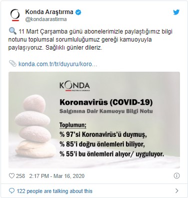 Konda'nın koronavirüs (Covid-19) salgını hakkında yayımladığı bilgi notuna göre, Türkiye'de toplumun yüzde 97'si koronavirüse ilişkin duyuma sahip, yüzde 86,5'iyse virüsün nasıl yayıldığını biliyor.