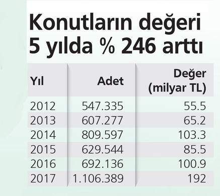 Bu durum da son 5 seneye göre rekor bir artış getirdi. 2012 yılından itibaren ocakeylül dönemine bakıldığında 5 senede ruhsat alan daire sayısı yüzde 102 oranında arttı. 2012 yılının ilk 9 ayında 547 bin 335 adet daire ruhsat alırken bu yılın ilk 9 ayında 1 milyonun üzerinde daireye ruhsat verildi. Bu rakam 2014, 2015 ve 2016 yıllarının aynı döneminde sırasıyla; 809 bin 597, 629 bin 544, 692 bin 136 adetti.