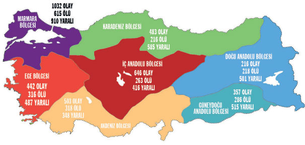 Bireysel silahlarla 2018’de işlenen şiddet haritasına bakıldığında; Türkiye genelinde en çok suçun işlendiği bölge Marmara Bölgesi. İstanbul ise en çok olayın yaşandığı il. 2017 yılında 351 olayın basına yansıdığı İstanbul’da, 2018 yılında da toplam 472 olay basına yansıdı. İstanbul’da 2018’de 2017’ye göre yüzde 34’lük artış oldu. İkinci sırada ise Sakarya var. Sakarya’da bir önceki yıla göre suç oranında yüzde 42 oranında artış dikkat çekti.