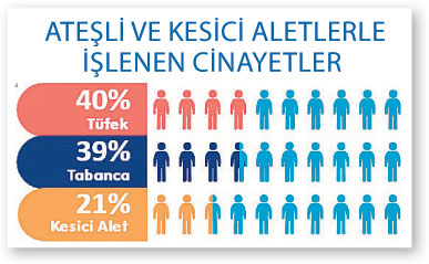 Bireysel silahlanmaya karşı mücadele veren Umut Vakfı’nın hazırladığı ‘Türkiye’nin silahlı şiddet haritası ve 2018’ raporuna göre, şiddet her geçen gün artıyor. Vakfın basında yansıyan haberlerden oluşturduğu istatisliklere göre; 2018 yılında basına 3 bin 679 olay yansımış durumda. 2015 yılında ise bu rakam 2 bin 175. Bu da yaralama ve öldürmeye varan silahlı şiddette son 4 yılda yüzde 69 artış yaşandığını gözler önüne serdi. Bu cinayetlerin bin 478’inde tüfek, bin 429’unda tabanca kullanıldığının vurgulandığı raporda, tüfek ediniminde geçen yıllara oranla büyük artış yaşandığının altı çizildi.