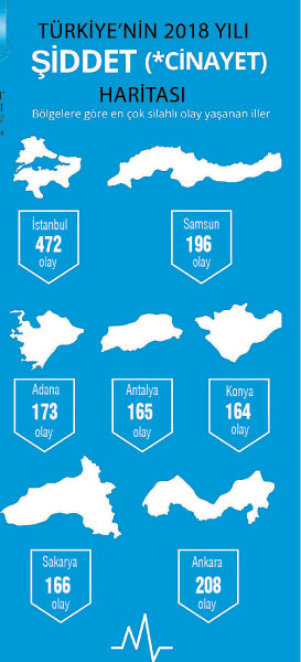 Raporda iller bazında şiddete bakıldığında ise; bazı illerdeki artış dikkat çekti. Sivas’ta 2017’de 14 olay yaşanırken, 2018’de yüzde 80’lik artışla 25 silahlı olay görüldüğü ve 20 kişinin öldüğü kaydedildi. Adana ve Antalya ise suç oranlarında yarışıyor.