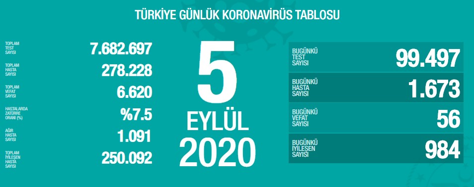 Sağlık Bakanı Fahrettin Koca 5 Eylül 2020 tarihine ait günlük korona virüs tablosunu açıkladı. Bakan yaptığı açıklamada şu nota da yer verdi: