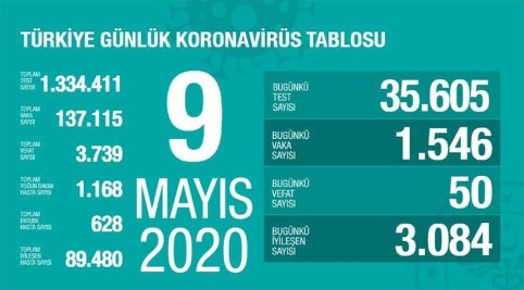 Sağlık Bakanlığının internet sitesinde yer alan ve Sağlık Bakanı Fahrettin Koca'nın da Twitter'dan paylaştığı "Türkiye Günlük Korona virüs Tablosu"nun güncel verilerine göre, bugün 35 bin 605 test yapıldı, 1546 kişiye Kovid-19 tanısı konuldu, 50 kişi hayatını kaybetti.
