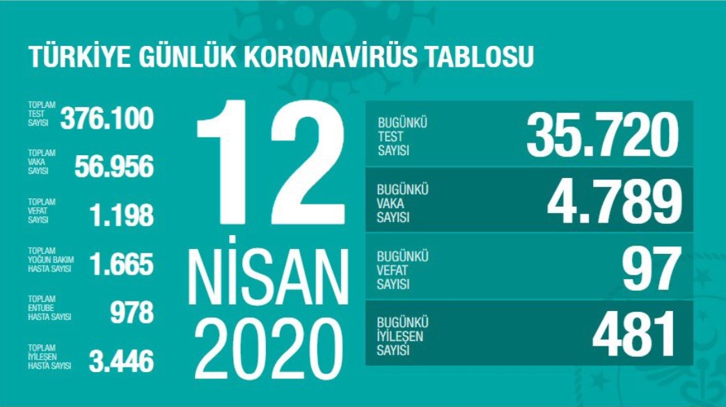 Tabloya göre Türkiye'de son 24 saattte 25 bin 720 test yapıldı. 4 bin 789 tanı konulması ile toplamda 56 bin 956 vaka oldu. Bu vakaların bin 665'i yoğun bakımda bulunuyor. 3 bin 446 kişi iyileşti.