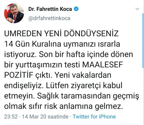 Bakan Koca Twitter heabından yaptığı açıklamada, umreden dönen vatandaşların 14 gün kuralına uymaları gerektiğini belirterek şunları kaydetti.