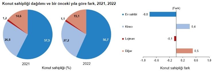 Buna göre, oturulan konuta sahip olanların oranı geçen yıla göre 0,8 puan azalarak 2022 yılında yüzde 56,7’ye geriledi.
