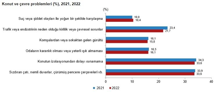 Kurumsal olmayan nüfusun yüzde 33,6’sı konutunda izolasyondan dolayı ısınma sorunu ile sızdıran çatı, nemli duvarlar, çürümüş pencere çerçeveleri vb. problemleri yaşarken, yüzde 21,7’si trafik veya endüstrinin neden olduğu hava kirliliği, çevre kirliliği veya diğer çevresel sorunlarla karşılaştı.