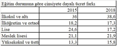 Eğitim seviyesine göre bakıldığında, ilkokul ve altı eğitim düzeyindeki kadınlar erkeklerin yüzde 38,6’sı kadar ücret alırken, yüksekokul ve üzeri eğitim seviyesinde bu oran yüzde 15,8’e geriliyor.