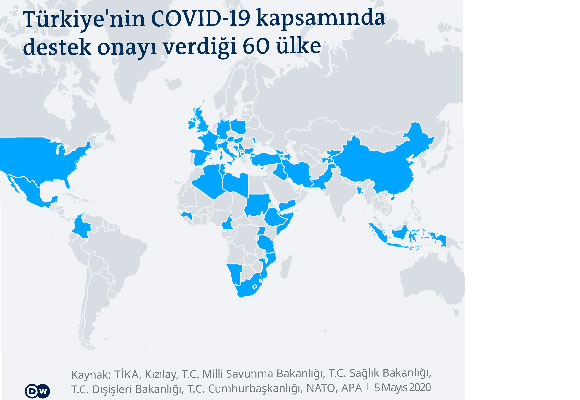 Resmi kurum ve yetkililerin Kovid-19 kapsamında tıbbi malzeme desteği yapıldığını belirttiği ülkeler ise Türkiye ile birlikte aşağıdaki haritada yer alıyor.
