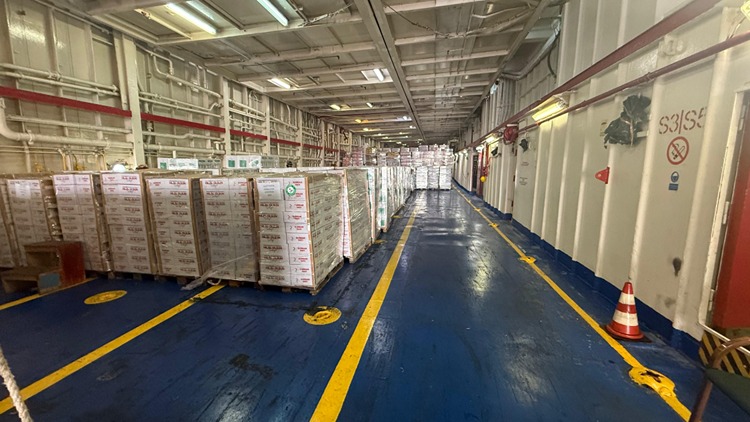 Gemideki yaklaşık 900 tonluk insani yardım malzemesi arasında bebek maması, hazır gıda, konserve ürünler ve temel ihtiyaç malzemeleri yer alıyor.