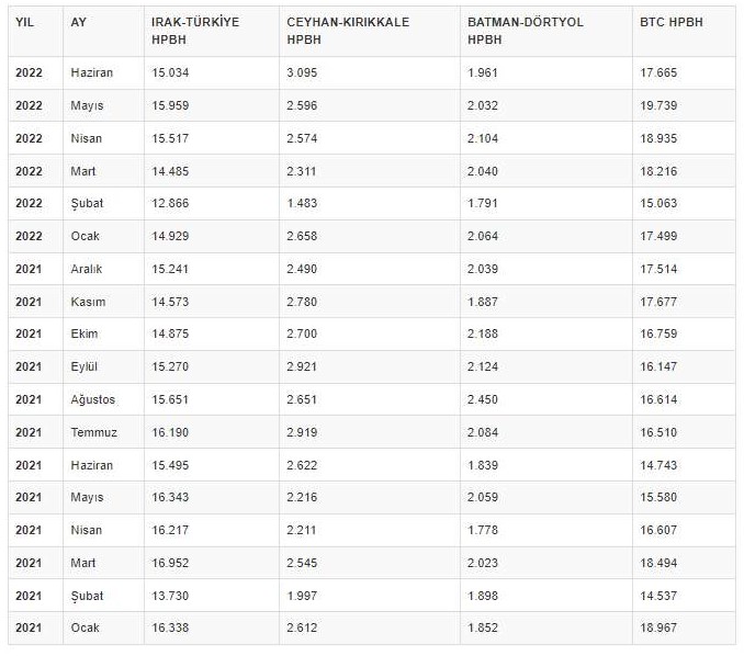 2021 yılının Haziran ayında söz konusu boru hatlardan 34 milyon 699 varil ham petrol taşıması yapılmıştı. Böylece geçen yılın aynı ayı ile karşılaştırıldığında ham petrol taşımalarında yüzde 8,8 artış yaşandı.