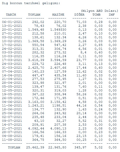 Merkez Bankası'nın yayınladığı verilere göre, 11 Ağustos haftasında 364,75 milyon dolar olan toplam dış borç ödemelerinin 364,50 milyon doları Hazine, 0,25 milyon doları diğer ödemelerden oluşurken, TCMB ve IMF'ye ödeme yapılmadı.