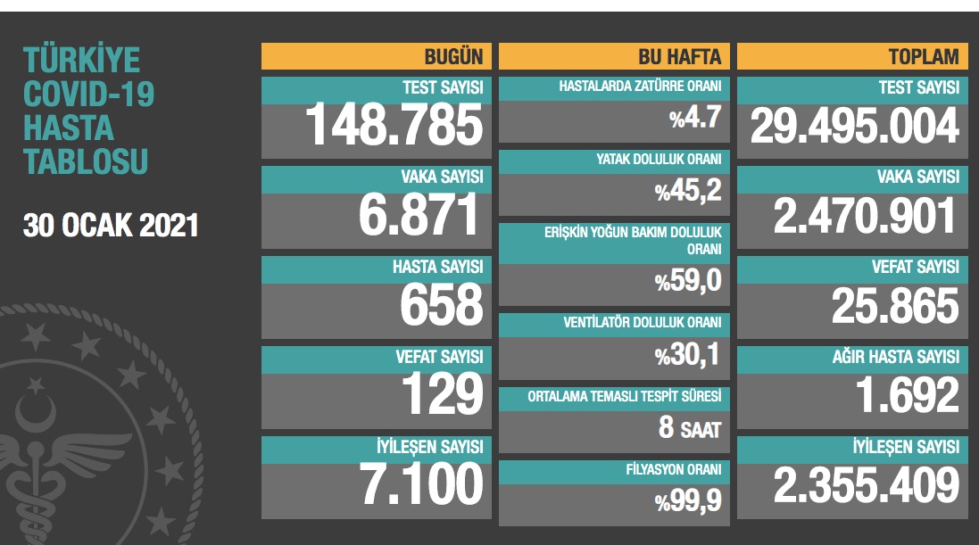 Türkiye'de son 24 saatte 148 bin 785 kovid-19 testi yapıldı, 6 bin 871 kişinin testi pozitif çıktı, 129 kişi hayatını kaybetti.