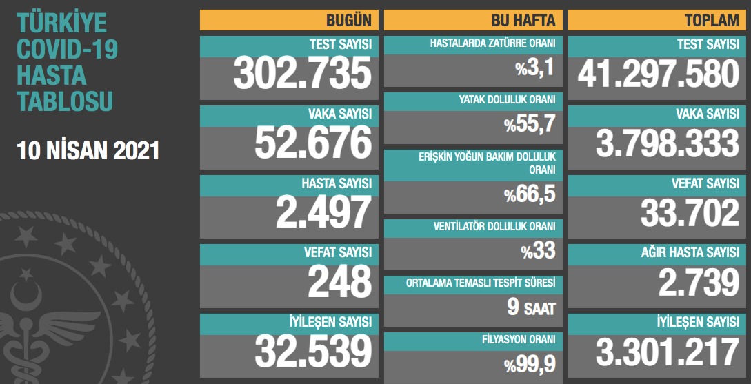Sağlık Bakanlığı, Türkiye'nin Günlük Kovid-19 Tablosu'nu paylaştı. 10 Nisan'da açıklanan son 24 saatlik verilere göre; 2,497’i semptomatik olmak üzere toplam 52 bin 676 yeni vaka tespit edildi. Vefat sayısı ise 248 olarak kayıtlara geçti. Böylece Türkiye'de Kovid-19 nedeniyle hayatını kaybedenlerin sayısı 33 bin 702’ye, toplam vaka sayısı ise 3 milyon 798 bin 333’e yükseldi.